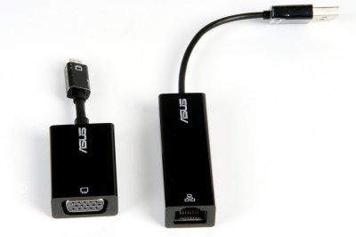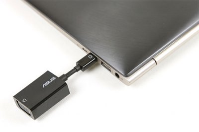 В самом начале нашего обзора мы заметили, что в комплект поставки ASUS Zenbook UX31A входит набор переходников, позволяющих компенсировать отсутствие некоторых важных портов; давайте рассмотрим эти переходники более подробно. Первый их них позволяет вывести картинку с ноутбука на любой VGA-монитор, а второй служит ультрабуку разъемом RJ-45. Плюс такого решения в том, что они входят в комплект и Вам не нужно будет покупать их отдельно, а минусом является нужда пожертвовать USB-портом, которых в ультрабуке и без этого маловато.