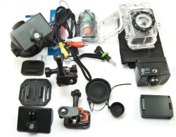 Очень важным моментом является то, что для полного использования всего функционала нет необходимости что-либо докупать отдельно – все необходимые аксессуары идут в комплекте, который, помимо традиционных АV- и USВ кабелей и автомобильного зарядного устройства, включает в себя карту памяти емкостью 4 ГБ, крепление для установки устройства на лобовое стекло автомобиля, липучку на торпедо, плоское крепление на сноуборд, изогнутое крепление на шлем или переднее крыло велосипеда (мотоцикла), съемную панель управления с TFT-дисплеем, водонепроницаемый бокс для подводной съемки и пульт дистанционного управления.