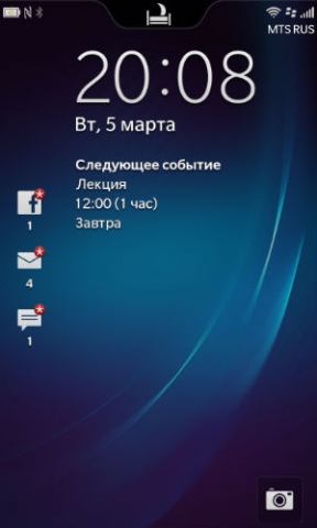 На экране блокировки отображаются время, дата, день недели, события календаря, пропущенные вызовы, принятые SMS, электронные письма и сообщения из социальных сетей. Если нажать на значки пропущенных событий, то можно увидеть подробности, например, при нажатии на значок принятого электронного письма отобразится имя отправителя и тема письма. В нижнем правом углу дисплея можно увидеть иконку быстрого запуска камеры. Для запуска нужно нажать на иконку и пару секунд удерживать на ней палец.