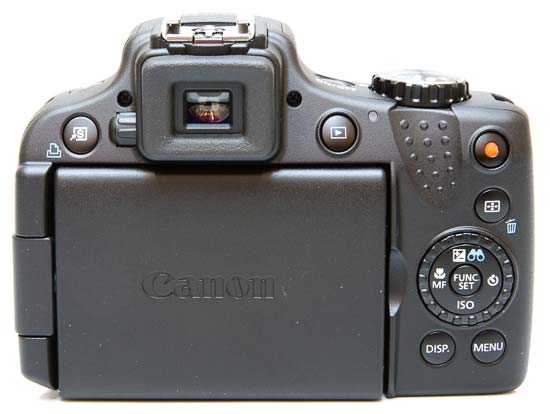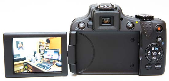 На обратной стороне располагаются: видоискатель, кнопка для записи видео, кнопка для просмотра отснятого материала, кнопка раскадровки, клавиши настройки дисплея и входа в меню. Также здесь расположился многофункциональный джойстик. На этой же стороне мы видим дисплей с поворотным механизмом. Сочетание поворотного дисплея и самой компактной зум-камеры, делает ее невероятно удобной в использовании.