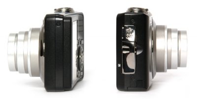 Задняя панель данной модели представлена дисплеем и наличием разных клавиш, круглых по форме и удобных в управлении. Это: клавиши выбора режима съемки, клавиша перехода в режим просмотра, клавиши удаления и входа в основное меню (расположены очень близко к нижнему краю, что несколько утрудняет их нажатие при использовании), круглая многофункциональная клавиша с клавишей ввода по центру, представлена четырьмя позициями: вверх/режим работы вспышки, вниз/режим фокусировки, влево/таймер, вправо/введение экспокомпенсации. Особенностью последней клавиши есть особая удобность использования благодаря тому, что она может вращаться без ограничения хода. На верхней части панели расположены две клавиши: 1. клавиша включения фотоаппарата, окруженная индикатором светло-зеленого цвета; 2. двухуровневая клавиша спуска затвора, окружена рычагом управления трансфокацией, делающим съемку более удобной.