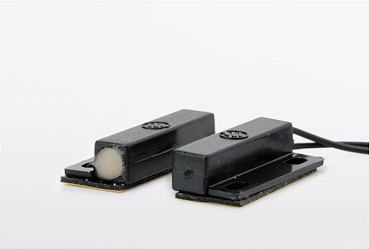 1. Проводные датчики. Такой датчик состоит из двух частей: постоянного магнита и магнитоуправляемого контакта (геркона) - элемента, проводящего электрический ток под действием переменного магнитного поля. В нормальном состоянии (дверь, на которой установлен датчик, закрыта) блок с герконом и магнит сомкнуты. Датчик срабатывает при отдалении магнита от геркона (дверь открыта), так как геркон размыкается и перестает проводить ток.