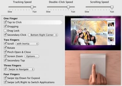 Жесты, используемые при работе, должны быть знакомы большинству пользователей Mac. По умолчанию, два пальца используется для прокрутки страниц, поддержка во все направления, в то время как 3-мя пальцами можно вперед и назад перелистывать страницы или закладки. Также поддерживается масштабирование двумя пальцами и поворот изображения при помощи жеста вокруг своей оси, или смена ориентации. Четыре пальца, тем временем, могут вызвать приложение, между которыми можно переключатся нажимая вверх или вниз, а также махая слева и справа. Благодаря новой панели настройки, можно выборочно отключить определенные жесты, если вы не используете их, настроить отслеживание, а также изменить поведение Magic Trackpad тремя пальцами пользователя. Вместо того чтобы листать страницы, вы можете перетаскивать окно по экрану (такое новое обновление добавляется в дополнительные функции и для трекпадов MacBook).
