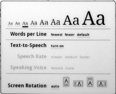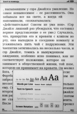 Разочаровало количество возможных операций с текстом: добавление закладок, поиск слова и переход на страницу. Отдельного масштабирования текста (reflow) нет, функции озвучивания (text-to-speech) нет. Есть возможность изменять масштаб всей страницы целиком, при этом появляются горизонтальная и вертикальная полосы прокрутки. Также можно менять ориентацию с книжной на альбомную и обратно.
