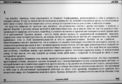 В открытой книге над и под текстом отображается дополнительная информация. В верхней статусной строке – название книги, состояние беспроводного модуля и индикатор заряда аккумулятора. В нижней строке – индикатор «прочитаности», количество страниц в книге и locations – точное место чтения.