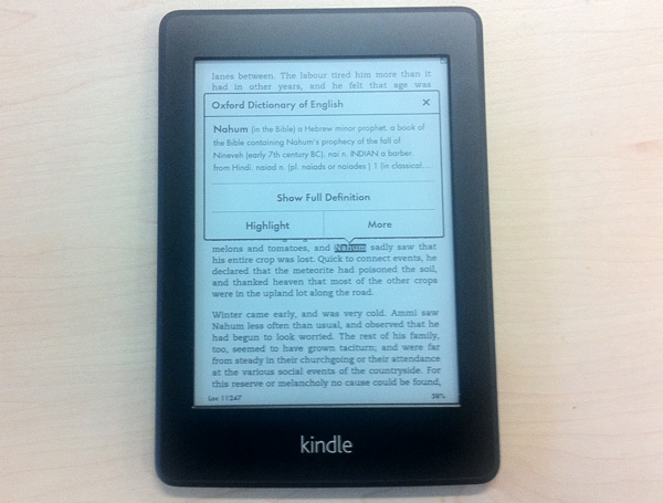 Разрешение было увеличено до 768 x 1,024, с плотностью пикселей в 212dpi. Это дает возможность сделать текст четче. Конечно, плотность пикселей этой электронной книги намного меньше, чем на экранах Retina iPhone 5, но даже если вы поднесете Amazon Kindle Paperwhite очень близко к лицу, то заметите, что не будет никакого распада изображения, а это очень часто встречалось в ранних версиях.