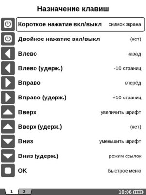 Самое полезное, что я для себя нашел, так это переназначения функций клавиш устройства. Ридер определяет два типа нажатия для всех кнопок – короткое и длинное, а для клавиши включения еще и третий вариант – двойное нажатие. На каждую клавишу и каждый тип нажатия можно «повесить» свою операцию.