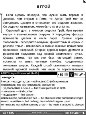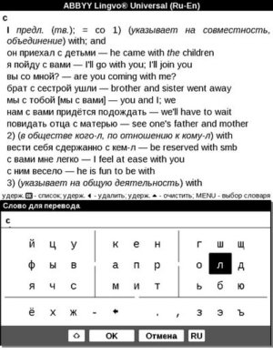 «Словарь» В устройстве имеется словарь Abbyy Lingvo Universal. Для выделенного или текущего слова в окне словаря дается перевод и прочие пояснения. Здесь можно также редактировать слово, менять язык для перевода... Интерфейс интуитивно понятен, хотя пользоваться словарем без сенсорного экрана не очень удобно.
