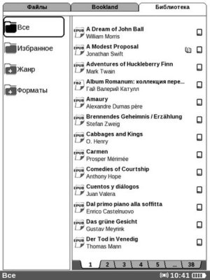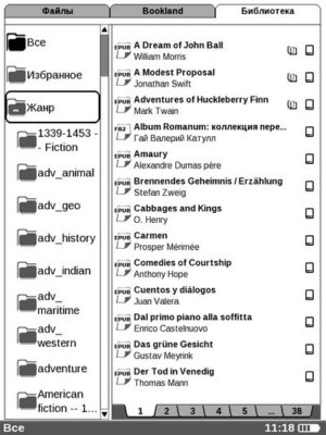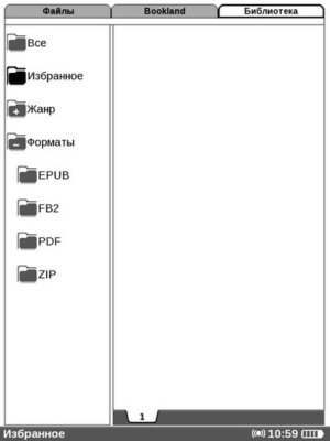 Интерфейс такой же, как и во вкладке «Файлы», с тем лишь отличием, что в левом окне, вместо папок, здесь располагаются категории. Их четыре: «Все», «Избранное», «Жанр», «Форматы». Думаю, вы поняли, какие книги относятся к первым двум категориям.
