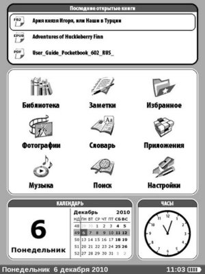 Но вернемся к стартовой странице. Пункт «Библиотека» я разобрал по полочкам. Но PocketBook 602 Pro кроме чтения книг обладает и иными функциями и возможностями.