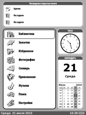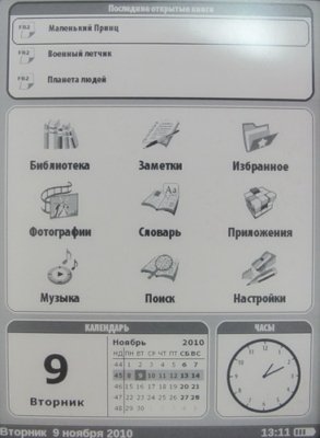 После запуска ридера, на экране появляется стартовая страница. Она может быть двух видов. На ней размещены окно с главными видами действий, окно «истории», календарь и часы.