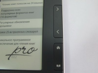 На PocketBook 602 Pro установлен 6-ти дюймовый экран, выполненный по технологии E-ink. Разрешение дисплея довольно большое - 800х600 точек, что позитивно влияет на качество картинки. Градаций серого - 16, чего более чем достаточно для отображения текста. Хватает даже для просмотра фотографий, но в черно-белом цвете.