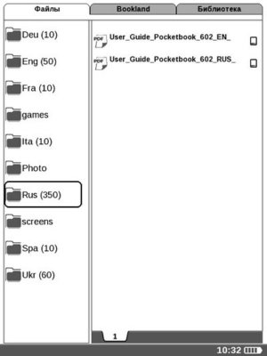 Библиотека представляет из себя окно с тремя вкладками: "Файлы", Bookland, "Библиотека".