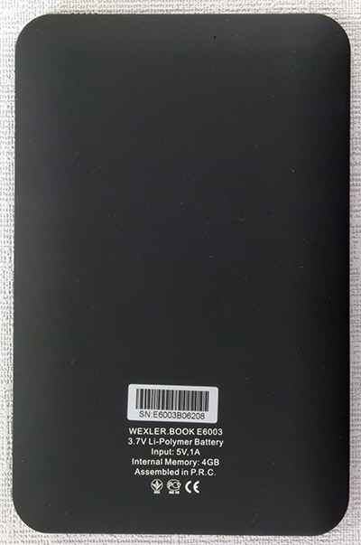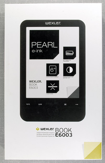 Передняя сторона демонстрирует изображение Wexler.Book E6003 и название модели. Набранная небольшим шрифтом надпись на русском языке (Wexler российская компания) говорит об использовании экрана на базе электронных чернил.