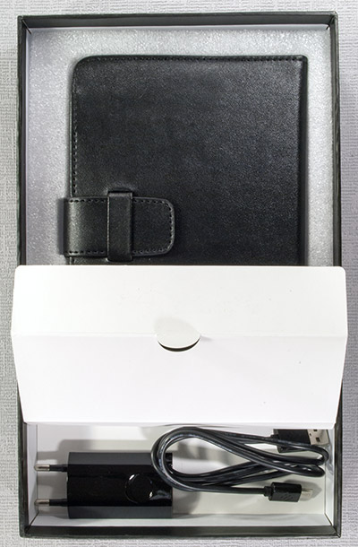 Приступим к осмотру содержимого коробки. Комплект поставки позволяет обойтись без дополнительных затрат. Он включает небольшой пакет бумажной документации, USB-кабель для подключения книги к компьютеру, обложку и зарядное устройство. Электронная книга уже помещена в чехол. Рассматриваемый экземпляр поставлялся вместе с бонусной картой, используемой при покупках в фирменном магазине Wexler.
