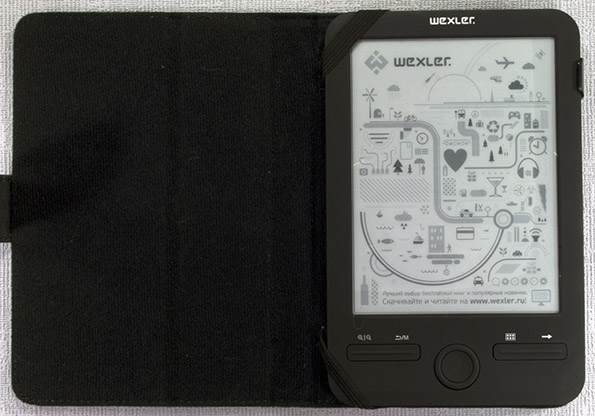 Посмотрим, чем сможет порадовать своего владельца Wexler.Book E6003. Его габариты составляют 177х115х11 мм, а масса всего 167г. Вместе с фирменной обложкой вес увеличится до 253г. Встроенной памяти довольно много, целых четыре гигабайта. Учитывая тот факт, что данная модель может быть использована только как ридер, такого объема вполне достаточно. Но при необходимости можно установить дополнительную карту памяти. Поддерживаются карточки формата microSD/HC, объемом до 32 ГБ. Функционал поистине аскетичен, нельзя даже посмотреть графические файлы, не говоря уже о прослушивании музыки.