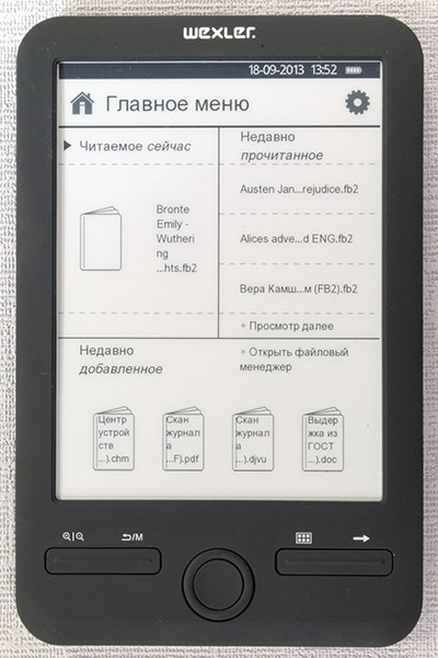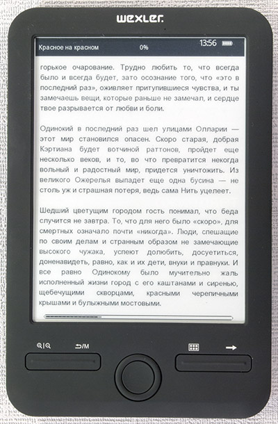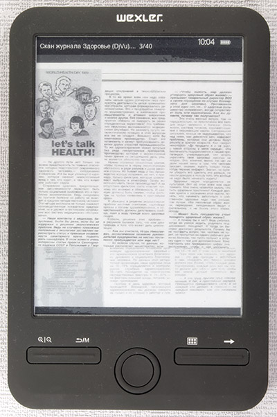 Как и подавляющее большинство других ридеров с небольшим экраном, Wexler.Book E6003 не слишком хорошо подходит для чтения книг в форматах PDF или DjVu. Читать можно, но вряд ли это доставит удовольствие. Кнопка увеличения шрифта не всегда работает корректно, контрастность и равномерность заливки иногда «хромают».