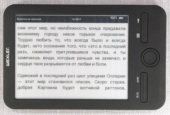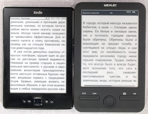Но наиболее интересна передняя грань электронной книги, на которой находится экран. Он выглядит вполне достойно, во всяком случае, до детального сравнения с более именитыми продуктами. Если положить рядом Amazon Kindle 5, то сразу становятся заметны некоторые недостатки продукта Wexler. Во-первых, шрифт E6003 выглядит несколько бледнее, а подложка имеет более темную тональность. Во-вторых, заметны огрехи в прорисовке линий. Впрочем, все вышеперечисленное не создает проблем при чтении.