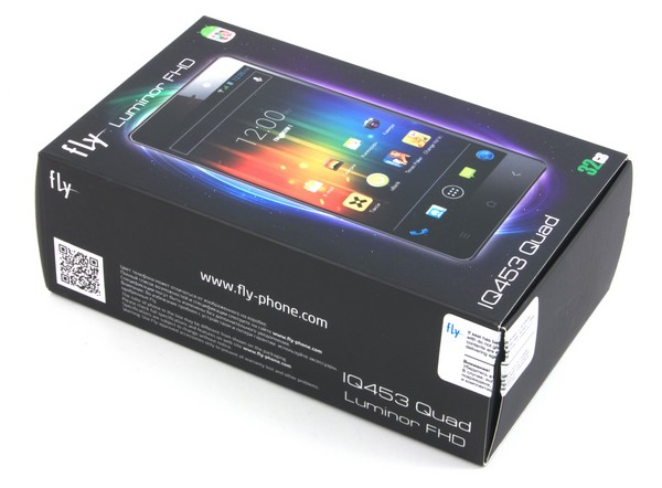 Fly Luminor IQ453 поставляется в чёрной матовой картонной коробке, на которой можно увидеть изображение смартфона, а также прочитать все его основные характеристики, в том числе объём внутренней памяти и версию операционной системы. Коробка обладает компактными размерами 100х58х165 миллиметров.