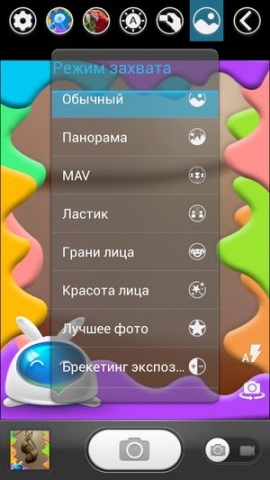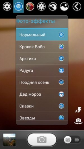 Интерфейс камеры не такой, как в «голой» Android. В нижней части экрана находятся иконка просмотра отснятого материала, виртуальная кнопка спуска затвора и значок переключения с фотосъёмки на запись видео. В верхней части экрана можно увидеть настройки. Пункты настроек отображаются небольшими круглыми значками.