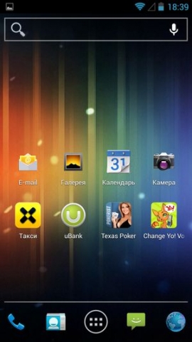 В верхней части главного рабочего стола располагается строка поискового запроса Google. Интересующую информацию в эту строку можно вводить не только вручную, но и при помощи голосового ввода.