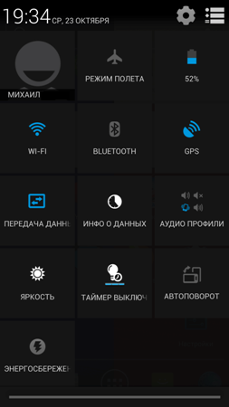 Из строки состояния вверху экрана выдвигается панель уведомлений. На ней предоставляется более подробная информация обо всех пропущенных событиях, закачанных файлах, установленных приложениях и тому подобное. На этой же панели располагаются крупные иконки быстрых настроек. С их помощью можно быстро изменять яркость экрана и звуковой профиль, включать/выключать беспроводные модули, режим полёта, автоповорот экрана, передачу данных, энергосберегающий режим, таймер выключения.