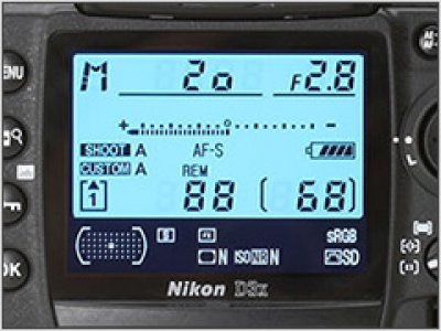 Как и D2 фотоаппараты серии D3/D3X имеют два дисплея панели управления. Один расположен на верхней панели камеры, другой – на задней. У обеих панелей есть зеленая подсветка, которая загорается при повороте переключателя питания в позицию освещения (CSM c2). Подсветка выключится автоматически. Вы также можете выбрать подсветку задней панели при нажатии любой кнопки (CSM d7). Вы можете настроить информационный дисплей на задней панели и дисплей видоискателя посредством CSM d5.
