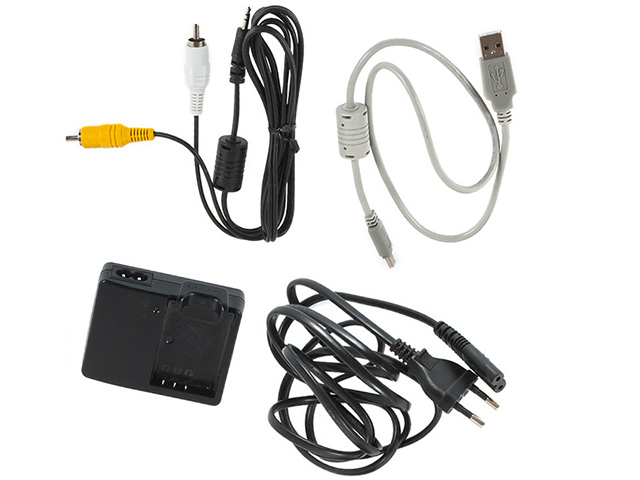В комплекте с корпусом покупатель получает зарядное устройство с отдельным сетевым шнуром, аккумулятор, кабели USB и AV-TV, а также небольшой пакет бумажной документации.