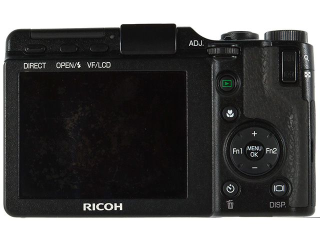 Справа от монитора размещаются пятипозиционный джойстик и четыре управляющие кнопки. Довольно большой участок задней панели, справа и сверху от джойстика имеет специальное антифрикционное покрытие, которое существенно увеличивает надежность хвата. В верхнем правом углу находится качающаяся клавиша, служащая для управления трансфокатором. Над дисплеем располагаются кнопки DIRECT, OPEN/f и VF/LCD. На том же уровне, но немного правее, находится трехпозиционный регулятор ADJ.