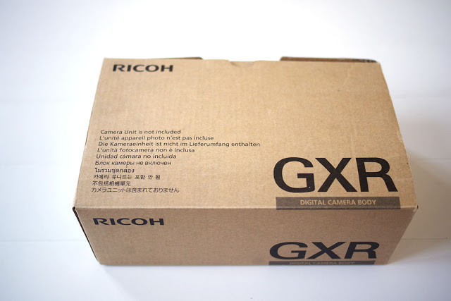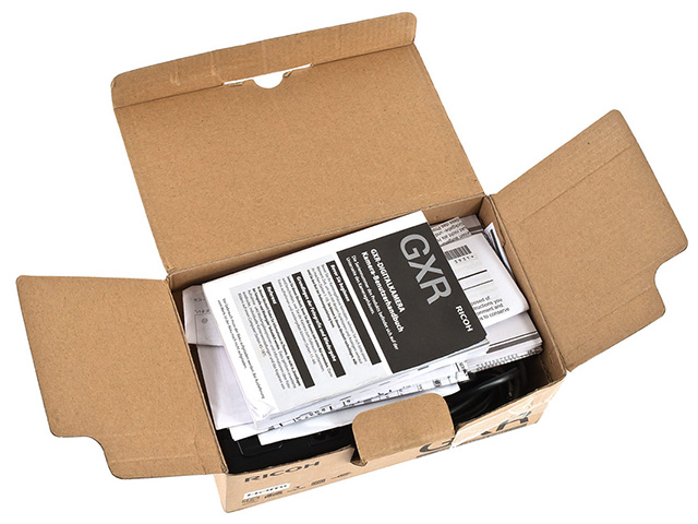 В продажу Ricoh GXR поступает в картонной коробке из неокрашенного упаковочного картона. Оформление упаковки отличается крайним минимализмом. Кроме названия модели, на передней стороне можно прочесть уведомление на десяти языках (русский также присутствует), информирующее об отсутствии камерного блока. В отличие от зеркалок, часто поступающих в продажу в комплекте с китовым объективом, Ricoh GXR обычно продается по частям. На это следует обратить внимание при покупке, так как большинство интернет-магазинов снабжает неказистую «тушку» изображениями камеры в собранном состоянии.