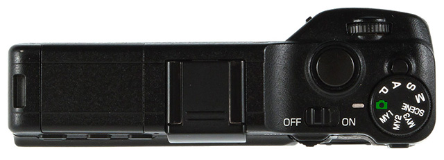 На верхней панели расположены поднимающаяся вспышка, диск переключателя режимов съемки с фиксатором, горячий башмак, диск изменения параметров, выключатель питания и спусковая кнопка.
