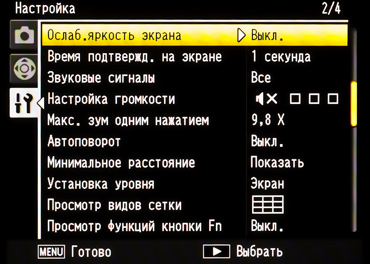 Третье подменю называется "Настройка". В нем задаются такие параметры камеры как громкость звука, язык, время автоматического отключения, яркость экрана и другие.