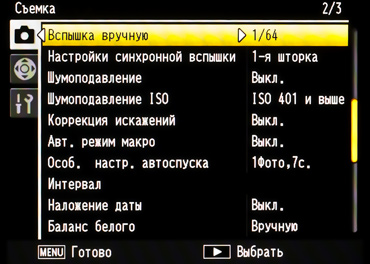 Меню делится на три группы. К первой относятся настройки съемки. В этом подменю можно изменить настройки экспозиции, фокусировки, баланса белого, шумоподавления, мощности вспышки, автоспуска и качества сохраняемого изображения.