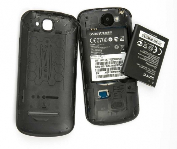 Чтобы вставить СИМ-карты и карту памяти, необходимо снять заднюю крышку, для чего нужно приложить небольшое усилие. Там же, под крышкой, находится батарея на 200 мАч.