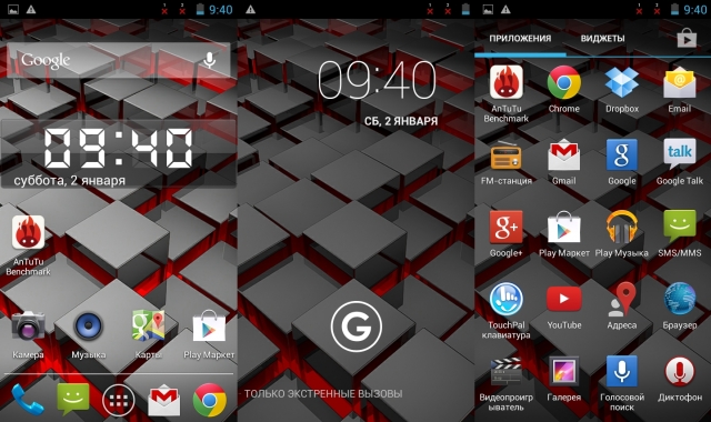 Смартфон работает на ОС Google Android 4.2.1 Jelly Bean. Система имеет традиционный внешний вид, за исключением дополнительных виджетов (цифровых часов и смены СИМ-карты), собственных приложений, а также специальной клавиатуры TouchPal (можно набирать текст пальцем, не отрывая его от клавиатуры).