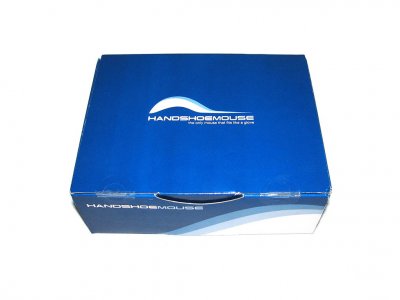 HandshoeMouse поставляется в синей коробке с названием продукта под логотипом. Логотип представляет собой изогнутые формы, но на самом деле это абстрактное представление формы мыши.