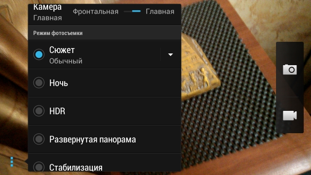 В настройках камеры можно выбрать режим съёмки (HDR, развёрнутая панорама, ночь, сюжет), качество записи видео (Full HD, HD или MMS), отрегулировать контрастность, насыщенность и экспозицию, активировать функцию распознавания лиц, включить функцию автоопределения улыбки, установить таймер, баланс белого (лампа дневного света, дневной свет, облачно или лампа накаливания), выбрать значение светочувствительности и тому подобное. Кроме обычных фотографий, можно делать серии снимков.