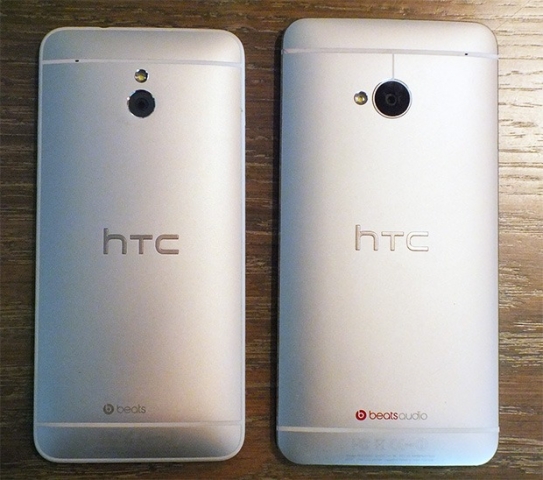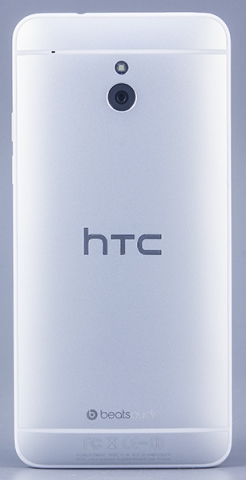 На тыльной панели HTC One mini расположены светодиодная вспышка, камера, надпись «HTC» и логотип Beats Audio. Объектив камеры немного утоплен в корпус устройства, поэтому он защищён от царапин и ударов. Вспышка может применяться в качестве фонарика. Соответствующее приложение для этого уже установлено в смартфоне.