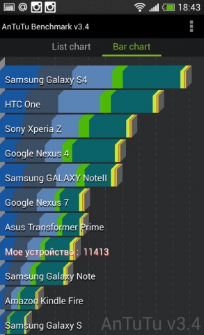 В синтетическом тесте производительности AnTuTu устройство набирает около 11 тысячи баллов. Скромный уровень производительности не позволяет запускать на устройстве некоторые энергоёмкие игры, например, Eternity Warriors 2 и Real Racing 3.