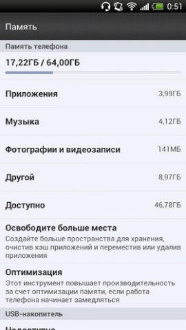 Объём внутренней памяти HTC One X+ составляет 64 гигабайта, из которых пользователю доступно около 56 гигабайт. Возможности расширения памяти смартфона нет.