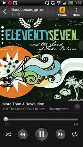 Нажатием на кнопку проигрывателя в главном меню HTC One X+ открывается папка с музыкальными приложениями. Там находится сам плеер, интернет-радио TuneIn, программа SoundHound и магазин музыки 7Digital.