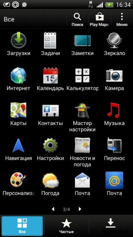 Главное меню состоит из иконок приложений, которые выстроены в алфавитном порядке. Есть возможность сортировки по дате. Отдельно можно просмотреть загруженные и часто используемые приложения. На одном экране выводится 20 иконок игр и программ, листаются они в горизонтальном направлении. В верхней части меню есть кнопки поиска, выхода в официальный магазин приложений и доступа к функциям.
