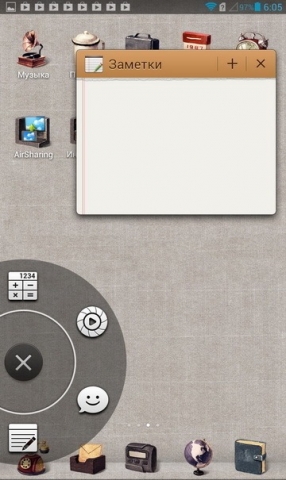 В левой нижней части экрана имеется кнопка быстрого доступа к некоторым приложениям. После нажатия на неё появляются ярлыки этих приложений, расположенные полукругом. Таким образом можно, например, открыть калькулятор или заметки. При этом приложение откроется в новом окне поверх всех активных программ. Эта кнопка активируется в настройках смартфона.