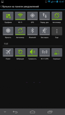 В верхней части экрана смартфона находится узкая чёрная полоска – сервисная строка, на которой отображаются время, заряд батареи, уровень приёма сигнала мобильной сети, включенные беспроводные модули, принятые сообщения, непринятые вызовы, новые загруженные файлы, уведомления, обновления и тому подобное. Из сервисной строки выдвигается «шторка» панели уведомления. На ней можно подробнее ознакомиться со всеми загрузками и обновлениями. Кроме того, на этой панели находятся иконки быстрых настроек: профили, яркость, автосинхронизация, Bluetooth, автоповорот экрана, Wi-Fi, режимы «без звука» и «в полёте», громкость, вибрация, скриншот, GPS. Пользователь может самостоятельно выбрать, какие настройки будут отображаться на панели уведомлений.