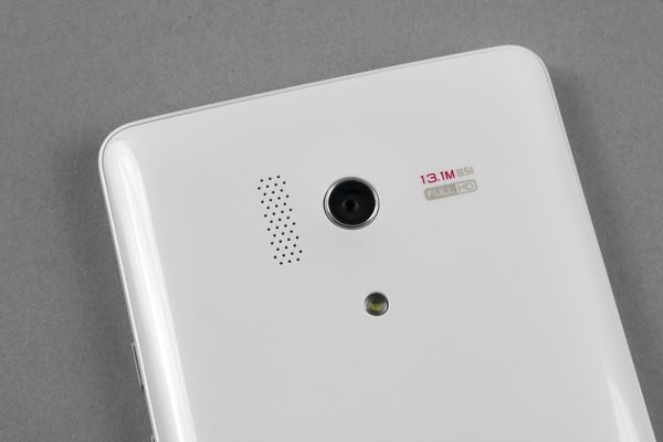В верхней части «спинки» Huawei Honor 3 посередине располагается круглый объектив камеры с металлической окантовкой. Слева от камеры можно увидеть многочисленные отверстия мультимедийного динамика, а справа – надписи, информирующие о возможностях камеры (разрешение). Чуть ниже располагается односекционная светодиодная вспышка. В самом низу тыльной панели устройства можно найти логотип компании.