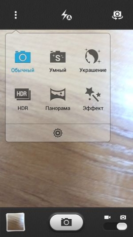 Настройки камеры открываются в полупрозрачном окошке. Тут можно выбрать размер фотографий, качество видео, режим съёмки (обычный, панорама, умный, украшение, эффект, HDR), активировать функцию определения улыбки, добавление геотегов и тому подобное.
