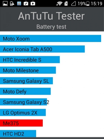 В режиме непрерывного воспроизведения видео формата AVI с максимальной яркостью экрана смартфон способен проработать от одного заряда батареи около 4 часов, а с более низкой яркостью (в районе 100 кд/м2) – около 6,5 часов. В режиме чтения электронных книг в программе FBReader аппарат может работать без подзарядки 11 часов 45 минут. В режиме игр с яркостью дисплея 100 кд/м2 устройство способно проработать автономно около 4 часов.