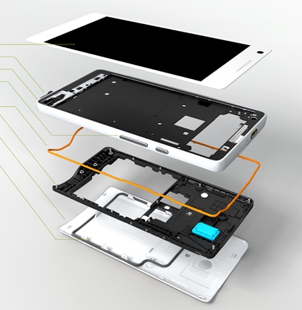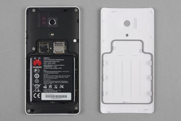 Задняя крышка аппарата является съёмной. Крепится она на защёлках. Для того чтобы её снять, нужно поддеть ногтём за небольшую выемку, предусмотренную на корпусе девайса. Под крышкой можно обнаружить два слота для карты памяти microSD и microSIM-карты, а также съёмную аккумуляторную батарею. «Горячая» замена карты памяти или SIM-карты в устройстве не предусмотрена, поэтому для их замены необходимо отключить смартфон и извлечь аккумулятор.