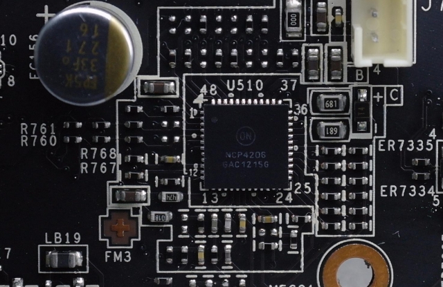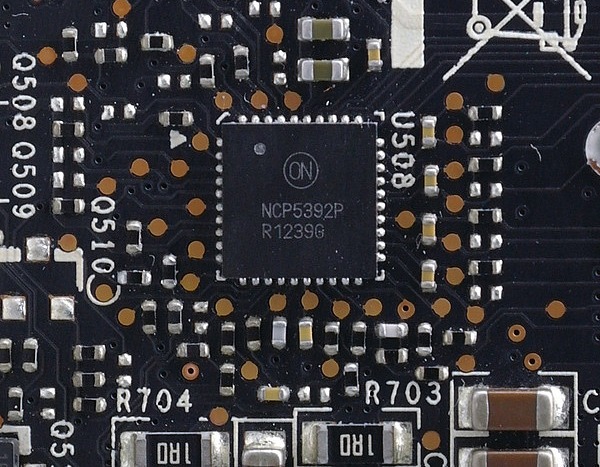Подсистема питания данной видеокарты состоит из 6 фаз. Четыре фазы питают графический процессор и две - видеопамять. Управляет фазами питания графического процессора контроллер NCP5392P от компании On Semiconductor.