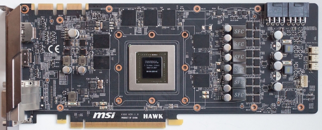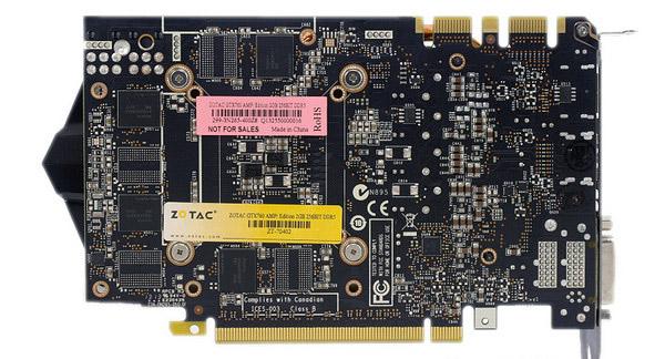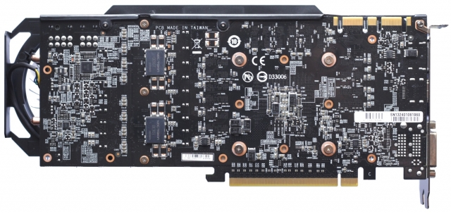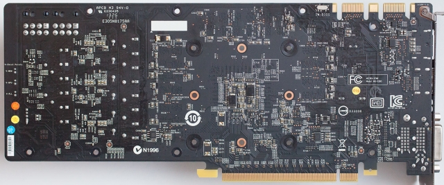На обратной стороне печатной платы расположены контактные площадки для замера напряжений питания. Контактные площадки не сгруппированы в одном месте, а разбросаны по печатной плате, из-за этого пользоваться ими неудобно. Графический процессор видеокарты тоже получил прибавку к номинальной частоте, хотя и не такую высокую. Его номинальная частота увеличена до 1058 МГц. В режиме GPU Boost она повышается до 1110 МГц. На видеокарте тоже используются микросхемы Hynix H5GQ2H24AFR, которые работают на частоте 6008 МГц.